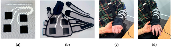 Figure 5a shows the layout of the printed carbon electrode (black) and sine wave track (white). The alignment of the electrodes to the forehand muscle is achieved by using a pre-arranged pattern and a thumb hole on the sleeve, which resulted in the desired muscle activation during user testing. The open wrap sleeve design and Velcro closure of the sleeve, as shown in Figure 5b, allowed participants to don and doff the e-sleeve independently using only one hand. Figure 5c,d show that one of the stroke survivor participants achieved an open hand gesture in FES stimulation while using the e-sleeve.