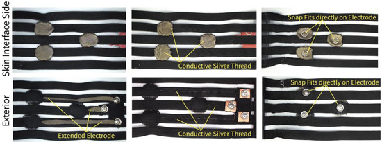 Three integration types were considered: extending the electrode material to a snap fit, sewing silver conductive thread to connect to a snap fit, and directly placing a snap fit on the electrode. Six samples were created, covering all combinations of fabric and integration types. Figure 1 shows how each integration technique is implemented into a stretchable armband.