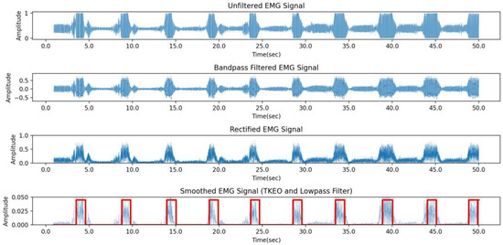 Unfiltered EMG signals were processed following the steps shown in Figure 2. Filtering frequencies were selected to reduce noise stemming from multiple sources including electrode motion artifacts, ECG artifacts, and power line interference [7].