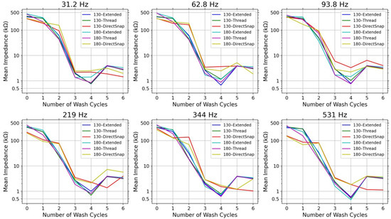 Plots of mean contact-impedance after each wash cycle for all samples at relevant frequencies.