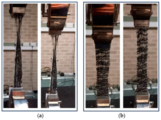 An Instron 5566 mechanical tester was used to analyse the force required to break strips of each fabric. Samples approximately 150 × 25 mm were cut from the fabrics in both the warp and weft directions. Care was taken to ensure that the same number of strands were analysed throughout the fabric and that the horizontal strands protruded from the samples. The strips were then placed into tensile testing grips with a 100 mm gauge length and secured. The crosshead (upper grips) was raised at a speed of 100 mm/min and the force required to maintain this speed was recorded.