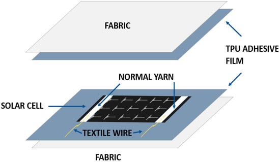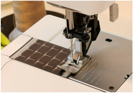 Among the many studies on solar textiles, the solar textile model is the best fit for the purpose of commercial production (Figure 1). Commercial solar cells are designed to be placed under the textile, replacing the solar cell integrated above the textile, and incorporating the principle of light passing through the fabric to reach the solar cell [1]. In existing solar textiles, the connection technology between solar cells and textile wires has not been sufficiently researched. Although the conductivity of some methods is very good, the operation steps are cumbersome and difficult to produce commercially. As in all electrical connections in e-textile applications, they must tolerate bending and twisting without breaking. Moreover, most techniques make the recyclability of the materials difficult after their life has ended. This study attempts to solve the problem of connecting solar cells to textile threads for the mass production of more sustainable solar textiles. It will facilitate research on solar textiles, which are expected to replace embedded batteries with solar cells within applications of e-textiles.