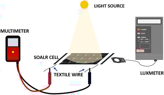The validation experiment was inspired by earlier research wherein textile-embedded solid solar cells and textile wires connected via tape have been shown to withstand 50 machine washings [2]. In this research, the solar cell textile components were delaminated after 15 machine washings, and the energy-harvesting capability was detected by measuring the direct current (DC) of individual solar cell components with an AMPROBE multimeter. All measurements were carried out with only one stable IKEA table lamp as the light source and in the same light position. The schematic of harvesting capacity measurement is shown in Figure 4. For each measurement, the density of light was measured with a luxmeter, which is Luxómetro RS PRO ILM1332A.