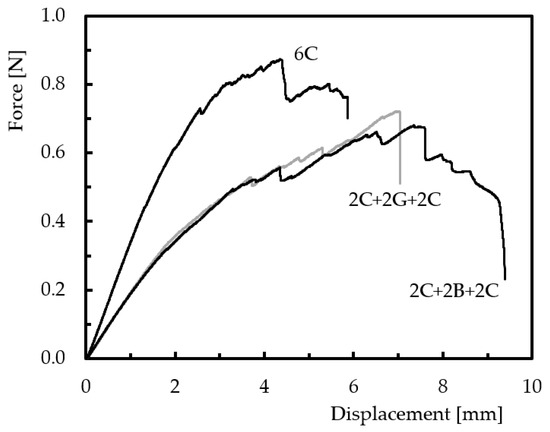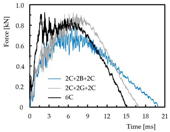 In terms of impact response, Figure 3 shows typical force–time curves obtained from the impact tests, which present a similar profile to those described in the literature [10,12]. The observed oscillations are caused by the vibrations of the specimen and depend on both the stiffness and mass of the specimen and impactor [13,14]. Furthermore, it is noteworthy that all configurations are characterized by a force increase up to a maximum value, followed by a drop after the force peak. This is more evident for the sandwiches, while for the cylindrical shells containing only carbon (6C), after some decrease, the force remains practically constant for some period of time, and only then does it decrease significantly. This curve, different from the others, reveals that, although the impact does not cause perforation, it is responsible for introducing more significant damage than in the sandwiches. In fact, brittle failures are characteristic of carbon fibers, which are fragile when compressed or exposed to impact loads [11].