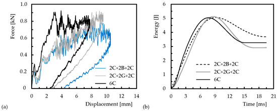 Regarding the force–displacement and energy–time curves, Figure 4 shows the respective responses of the different materials. In the first case, the force–displacement curves are very similar to the force–time curves, which are characterized by an increase in force up to a maximum value and a subsequent decrease, with the two distinct behaviors reported above. Therefore, these curves confirm that cylindrical shells involving only carbon fibers (6C) suffer more severe damage than sandwiches. The impactor strikes the specimens and rebounds, indicating that the impact energy is insufficient to enable full penetration, as may be inferred from all energy–time curves. In this instance, the start of the plateau denotes the loss of contact between the striker and the specimen and corresponds to the energy absorbed by the specimen [4]. Therefore, for an impact energy of 5 J, it is noted that the sandwich involving carbon and glass fibers (2C+2G+2C) is the one that absorbs less energy, while the other sandwich (2C+2B+2C) is the one that absorbs more energy.