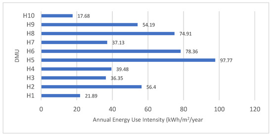 Annual energy use intensities of the surveyed hotels (DMUs).