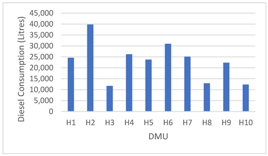 Figure 2 shows that the DMUs consumed an average of 22,970 liters of diesel for their annual operations. This quantity is higher than the diesel used by DMU H3, which had the least annual diesel consumption of 11,682 liters. DMU H2 recorded the highest diesel consumption of 39,790 liters, which correlated with its high occupancy ratio.