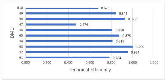 The DEA analysis showed that only DMU H3 was efficient, having a technical efficiency score of 1. All other DMUs had varying degrees of inefficiency, as well as slack and radial movements. These adjustments show the potential savings the DMUs will realize while raising their technical efficiency score to 1.