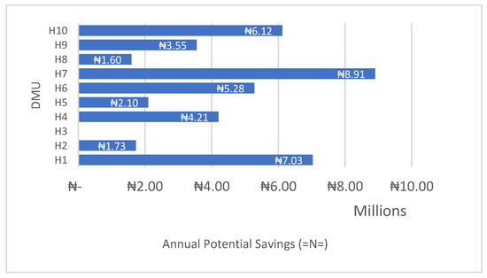 Figure 4 shows that all but one of the surveyed hotels had some amount of potential savings should they implement the recommended adjustments to improve their energy performance. DMUs H7, H1, and H10 had the highest potential savings of over NGN 8.91 million (USD 11,598.06), NGN 7.03 million (USD 9150.88), and NGN 6.12 million (USD 7966.34), respectively, while DMUs H2, H8, and H3 operated more efficiently, with potential savings of less than NGN 2 million (USD 2603.38) in a year.