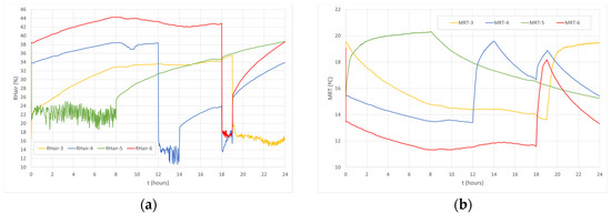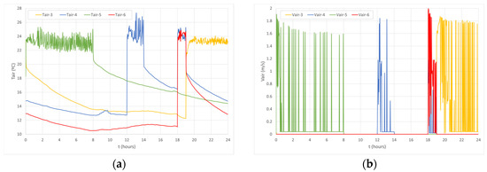 In Figure 2a, the evolution of Tair for spaces 3, 4, 5, and 6 is presented; in Figure 2b, the evolution of Vair for spaces 3, 4, 5 and 6 is shown; in Figure 3a, the evolution of RHair for the spaces 3, 4, 5, and 6 is presented; and in Figure 3b, the evolution of MRT for the spaces 3, 4, 5, and 6 is shown.