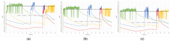 Evolution of Predicted Mean Vote (PMV) for the spaces 3, 4, 5, and 6 for (a) Case A, (b) Case B, and (c) Case C.