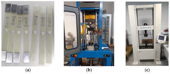 The static tensile strengths of the control specimens (zero impacts) and the impacted specimens were obtained using the universal testing machine Shimadzu AG-100 (Shimadzu Europa GmbH, Duisburg, Germany), represented in Figure 1c, with a 3 mm/min displacement rate. All the experimental tests were carried out at standard room temperature.