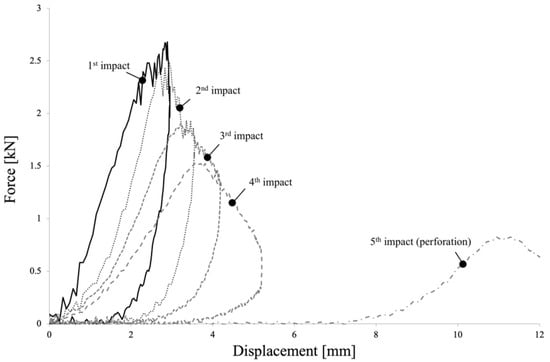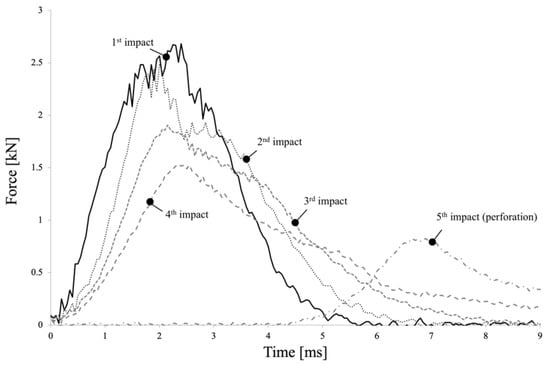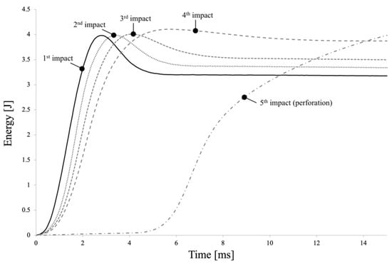 This consistent profile is observed across all impacts. It is noteworthy that the maximum force diminishes after each impact. For example, in comparison to the first impact, the maximum force decreases by approximately 7.6% at the 2nd impact, 30% at the 3rd impact, 42.6% at the 4th impact, and 68.4% at the 5th impact. Examining the maximum displacement depicted in Figure 3, it shows an increase of around 20.7% after the 2nd impact, and, from that point onwards, it approximately doubles its value with each subsequent impact. It is possible to appreciate in the energy–time curves represented in Figure 4 that the absorbed energy up until the 4th impact is not sufficiently high to cause puncture of the specimens. The impactor strikes the specimen, rebounds, and does not penetrate fully. However, at the 5th impact, full perforation occurs, resulting in the complete absorption of all impact energy. Moreover, it can be observed that the absorbed impact energy steadily increases after each impact. For example, compared to the 1st impact, the absorbed energy is 7.9% higher at the 2nd impact, and it further increases by 12% and 20.9% at the 3rd and 4th impacts, respectively. Finally, the contact time also extends with each subsequent impact. For example, the contact time increases by approximately 16% from the 1st to the 2nd impact, whereas it rises by about 44.8% and 124.2% at the 3rd and 4th impacts, respectively.