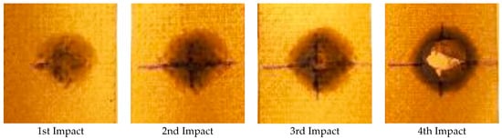 Figure 5 provides a visual representation of representative damaged areas resulting from impacts 1 to 4. As the specimens are already completely perforated at the 5th impact, their corresponding damaged areas were not included in the analysis. Upon the 1st impact, damage in the form of delamination is observed around the impact point, exhibiting a circular shape. This delamination area becomes more pronounced with the 2nd impact. While the damaged area seemingly remains unchanged at the 3rd impact, the failure of fibres becomes evident, resulting in partial puncture that becomes clearly visible by the 4th impact.