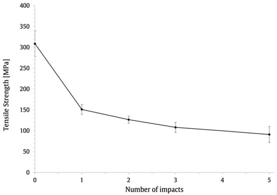 To assess the residual tensile strength of the multi-impacted specimens, static tensile tests were conducted. The residual tensile strength, for both the impacted specimens and the control ones, is shown in Figure 6.