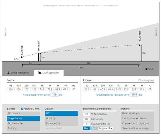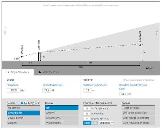 In this further analysis, the Javanese Christian Church as a place of worship has a barrier measuring 1 m high. The barrier is a fence made of iron and coated with black paint. The distance from the receiver to the barrier is 10 m, with a receiver height of 4 m. For analysis, the middle value of the receiver height taken is 2 m, while the distance from the barrier to the road is 2 m. After obtaining the required data, the data are then analyzed using NoiseTools.net software with a single frequency; see Figure 5.