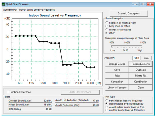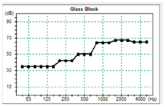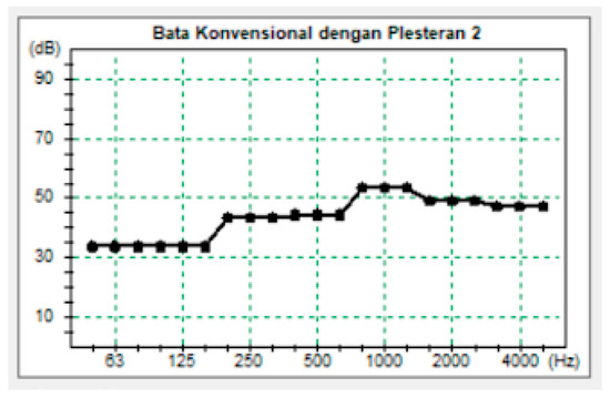 The window material is a glass block with a thickness of 11 cm. The glass block has the same STC value as that of a 150 mm thick concrete slab, namely 53 STC (sevesglassblockinc.com). Hence, to find out the acoustic coefficient of a glass block, you can use the concrete coefficient of 150 mm. The concrete coefficient was obtained from the Building Physics book [12]. The results of the analysis can be seen in Figure 9.