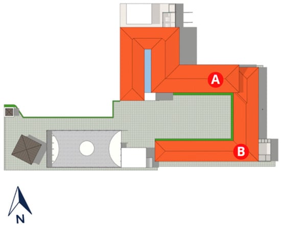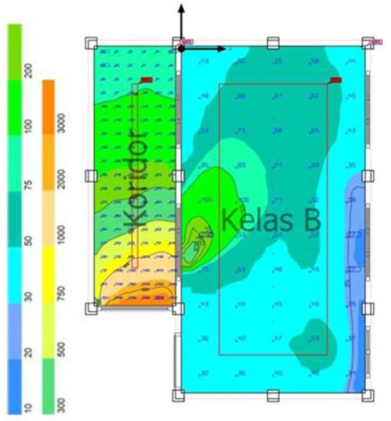 The lux standard for classrooms, according to the SNI (Indonesian National Standard), is 250–300 lux []. Some spaces have fairly large window dimensions, so the room is quite exposed to sunlight (Figure 3). This leads to an increase in room temperature and discomfort due to overheating, which can be seen in Figure 4. There are also some buildings that are less exposed to sunlight (Figure 5), so they are humid, especially the space in the south building at the east end, which can be seen in Figure 6.