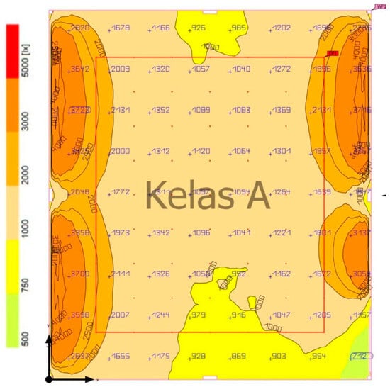Sample A (classroom with a large window, lux 7310) obtained via Dialux Evo 9.2.