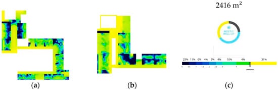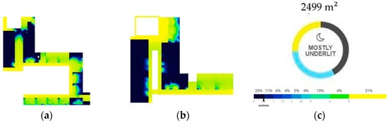(a) Natural lighting analysis of the existing first floor. (b) Natural lighting analysis of the existing second floor. (c) Simulation results.