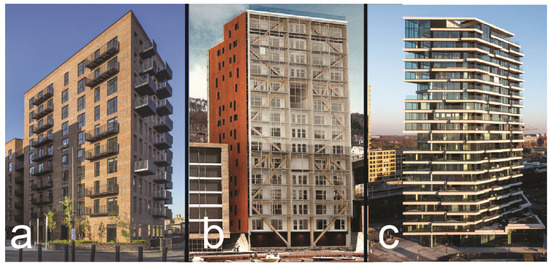 Undoubtedly, choosing the appropriate construction system is crucial. Contemporary and innovative wood-based construction techniques allow architects to design impressive structures. These buildings are not only visually attractive but also less harmful to the environment [14,15]. As a result, both the scientific and the economic sectors have refocused their attention on the potential of using wood as a renewable material for extensive construction. New building methods and materials using wood have been developed as a result of increased interest. Now, multifamily residential buildings such as Dalston Lane in London, UK, the Tree in Bergen, Norway, and Haut in Amsterdam, the Netherlands (Figure 3), can be built using these innovations.