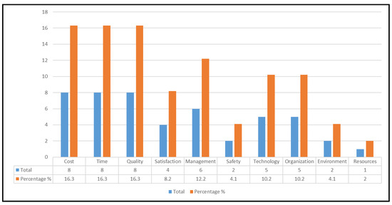 As highlighted in Table 1, an array of project evaluation criteria have been compiled by previous researchers. Figure 2 provides valuable insights into the representation percentages of these Critical Success Factors (CSFs) identified through an extensive literature review. Resounding consensus emerges among researchers, with cost, time, quality, and management consistently recognized as the foremost CSFs [12]. Often, these are translated into completing the project within the predefined cost parameters, adhering to the stipulated timeline, meticulously following the project schedule, meeting the required quality standards, and benefiting from effective management by a proficient team. Additionally, technology emerges as another influential CSF contributing significantly to the success of construction projects today [3]. Figure 2 supports the notion that there is a consensus, with cost, time, and quality each garnering a substantial 16.3% of the total CSF mentions. Satisfaction, management, technology, and organizational factors also hold significant weight.