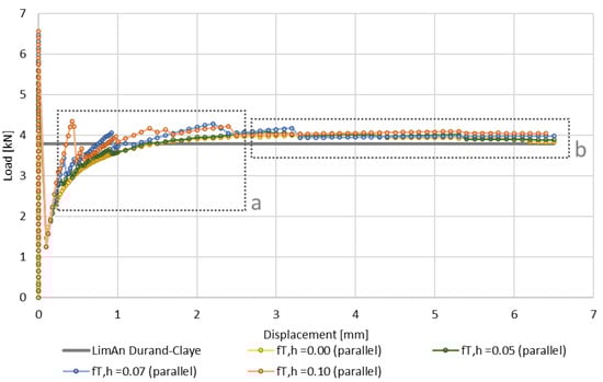 The results of such modelling are shown in the sensitivity analysis in Figure 1. It compares the collapse loads resulting from small changes in the tensile resistance assigned to horizontal joints only (fT,h), while vertical joints were set to be no-tension. The curves show some mutual differences in their behaviour in the first steps of the simulation (rectangle a in Figure 2), with a progressive loss of structural stiffness and the development of plastic hinges. While in the steps near the end, they tend toward the asymptote value given by the lower-bound Limit Analysis (LA) found in [9] (rectangle b in Figure 2).