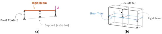 Additionally, a rigid base larger than that of the point load (a scheme in Figure 4a) is added to simulate the load distribution of a real architectural element on the crown of the dome. Then, to prevent out-of-plane sliding, shear resistance has been provided by a complex joint construction involving rigid beams, CoBs and shear trusses (the reader may refer to Figure 4b for more clarity). The failure of this structure is explained by the formation of a plastic hinge. For the sake of brevity, no more information will be reported here.
