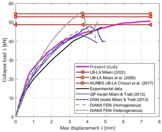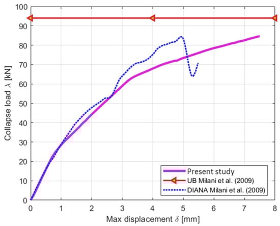 To recap the results that were obtained, the first method models masonry nonlinearity using elastic perfectly brittle PC, neglecting most of masonry’s tensile resistance (by Heyman’s hypotheses). Whereas in the second method, masonry nonlinearity is expressed by elastic perfectly plastic CoBs. The brittle behaviour of the first model ends in providing an accurate position of the plastic hinge but also a very conservative value in terms of collapse load. The contrary is achieved by the ductility imposed in the second model. This one was used as a baseline for the application of FRP strips, again by the addition of ductile CoBs. Indeed, the collapse load computed for the reinforced case (Figure 8) was almost twice that of the unreinforced case (Figure 9), demonstrating the efficacy of such interventions. The method itself proved to be robust and is therefore a very useful and practical way to model such additions for retrofitting or safety purposes.