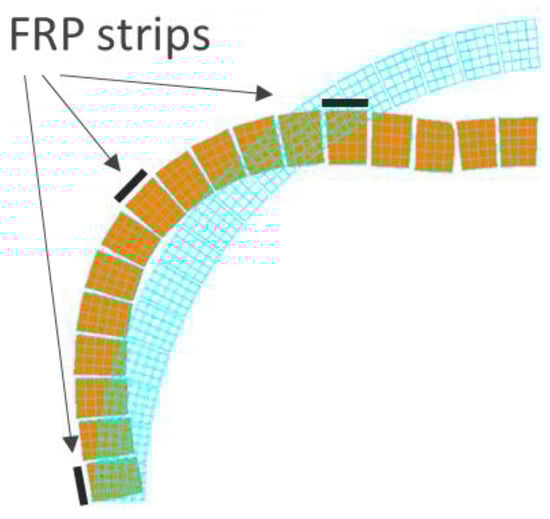 The following Figure 9 indicates where the FRP strips exert their confinement action against the formation of meridian cracks and an annular hinge. By comparison between Figure 9 and Figure 6, the efficacy of FRP reinforcement is shown.
