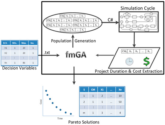 The simulation optimization module is implemented by embedding STROBOSCOPE simulation software [13] within the Darwin optimization framework [14], which utilizes fmGA, as shown in Figure 2. The integration of these two tools is done in Microsoft Visual C#. The minimum, maximum, and increment values for each decision variable is stored in a text file. The optimization tool accesses the text file and generates the candidate solutions using the specified boundaries. The developed code would then modify values of the decision variables within the simulation source code. Then, it starts the simulation tool and creates a new model with the modified source code. Next, it runs the simulation and extracts the project duration and cost. Finally, the code exports the project duration and cost to the optimization tool. At the termination of the optimization, the Pareto solutions are output into a text file.