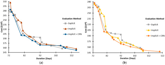Figure 3a shows the final Pareto fronts obtained from the first experiment. The Pareto fronts provided a non-dominated tradeoff between the project duration and cost. When examining the Pareto fronts, it can be noticed that all three methods were able to generate very close Pareto fronts. Table 1 summarizes the results of both experiments. It took 7.20 h to evaluate 100,000 candidate solutions using EA and 0.65 h for IA and ICRN, which resulted in an average time saving of 91%. Additionally, the ICRN approach achieved a 2.6% and 3.6% improvement in the quality of optimum solutions over EA and IA, respectively, as measured by the hypervolume indicator.