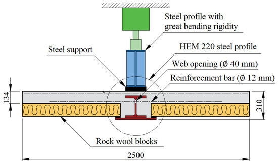 Braun et al. [6] experimentally analyzed the structural behavior of four prototypes called B1, B2, S1, and S2. All prototypes were manufactured using HEM 220 profiles, to which a 20 mm thick steel plate was welded (Figure 1). This profile was integrated into a composite slab concreted in situ, formed by steel decks and rock wool blocks.