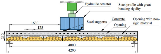 The structural configuration of these tests corresponded to a double-supported beam with a span equal to 8000 mm for prototypes B1 and B2 and 4000 mm for prototypes S1 and S2. All prototypes utilized the three aforementioned connection mechanisms. However, in prototype S2, some openings were filled with a low-stiffness material to prevent the formation of concrete dowels in these regions (Figure 2).