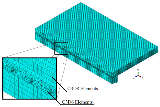 The FE models were discretized using elements of the solid-type C3D8, C3D6, applied in the regions that represent the steel profile and the concrete slab (Figure 3), and B31, applied in the regions that represent the reinforcement bars. In all cases, the maximum dimension of the finite elements was equal to 25 mm, a value defined after carrying out mesh tests. Following the methodology proposed by Paes [3], we chose to disregard the contribution of rock wool blocks.