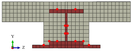 The mechanical behaviors of steel and concrete were simulated using the Plasticity and Concrete Damaged Plasticity models, respectively. Adherence was simulated using CONN3D2-type connection elements distributed between some nodes of the steel profile and the concrete slab (Figure 4). The translational movement of these connection elements was defined by the Slide-plane option, which allows the translation of the connected nodes along the local axes U2 and U2 and prevents movement along the local axis U1.