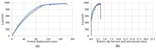 The modeling methodology presented in Section 2.1 is validated by comparing the load vs. deflection and load vs. relative slip curves obtained numerically with experimental ones presented by Braun et al. [6]. These results are shown in Figure 5, where the solid blue lines represent the results obtained through numerical simulations, while the dotted black lines correspond to the results obtained experimentally.