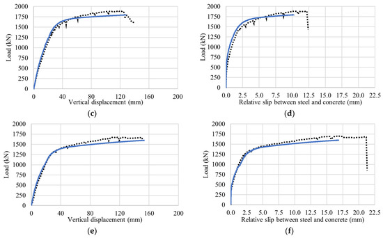 Comparison between experimental (dotted black lines) and numerical (solid blue lines) results. (a,b) Prototypes B1 and B2; (c,d) relative load vs. slip results of prototype S1; and (e,f) prototype S2.