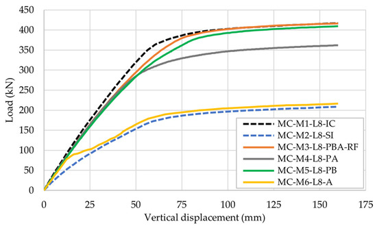 The influence of connection mechanisms can be analyzed through the load vs. vertical displacement curves shown in Figure 6. Based on these results, we can observe that the structural response of the reference model (MC-M3-L8-PBA-RF) is equal to the response of the model with a full iteration (MC-M1-L8-IC). This observation demonstrates that the connection mechanisms used are capable of transferring all the shear forces that occur at the steel–concrete interface. Therefore, in this case, the resistant bending moment is controlled by the mechanical resistance of the steel or concrete sections, which implies a situation of complete interaction.