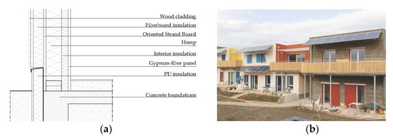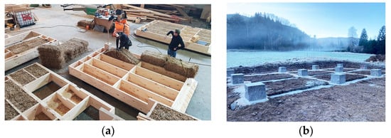 (a) Detail of the assembly of the wooden structural frame; each element is filled with straw. (b) A picture of the granite blocks and the concrete trusses that constitute the foundations (Source: studiolada.fr (accessed on 15 April 2023)).