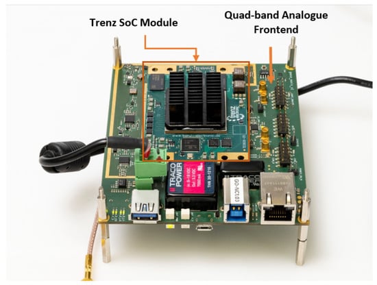 The benefits of employing a system on module (SoM) are the easy development, maintenance efforts and migration. On the one hand, the functionality is guaranteed by the manufacturer and it is typically possible to upgrade to an MPSoC device with a larger PL. On the other hand, they avoid the risks associated with the development of a customized FPGA board, because some special components like Random Access Memorys (RAMs) or FLASH memories cannot be bought in low volumes. The integrated SoC device is the ZynqTM UltraScale+TM XCZU15EG-1FFVC900E manufactured by Xilinx. The PS is characterized by a quad-core advanced Reduced Instruction Set Computer (RISC) machine (ARM) Cortex–A53 processor and a PL with approx. 750 K logic cells. The PL allows the implementation of real-time digital signal processing tasks at higher throughput. The firmware (FW) design mapped on the PL is described in Section 2.3.