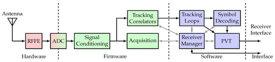 More satellite systems mean more Satellite Vehicle (SV) availability, lower Dilution Of Precision (DOP) and an improved PVT solution. However, the increased availability of systems offers more challenges to the receiver manufacturers in terms of hardware and software resources, along with increased power consumption. Furthermore, GNSS receivers should maintain the synchronization of a higher number of SVs. GNSS receivers like the GNSS-Receiver with Open Software Interface (GOOSE)© platform [] implement the tracking stage partly in hardware (correlators and Numerically Controlled Oscillator (NCO)) and partly in software (discriminators and loop filters). These receivers try to close the loop of all the tracking channels before a new correlation is performed. A low time complexity of the communication interface between the processor and the dedicated digital Hardware (HW) results in faster response and is essential to close the loop in time, avoiding synchronization failures. Also, the faster the response, the more tracking channels the GNSS receiver can manage. Moreover, a low time complexity in the communication interface enables the implementation of more complex and robust tracking architectures, such as Loop-Bandwidth Control Algorithm (LBCA)-based tracking architectures [,,].