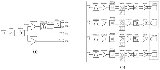 Figure 3 depicts the four-channel analog front-end of the GOOSE© v2. The input stage separates the antenna signal into four channels (see Figure 3a). After the limiter, the signal is divided into the L-band and S-band. A second diplexer is included in the L-band to split it into an upper and lower band. The lower band is connected to a splitter that creates two identical GNSS signals, which are processed separately (RF-1 and RF-2).