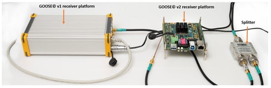 In order to test the communication aspect of HW and SW, a parallel test with GOOSE© v1 and GOOSE© v2 is conducted in our Galileo lab using the Spirent Radio-Frequency Constellation Simulator (RFCS). The aim is to find out the number of tracking channels that the GNSS receiver can handle. The test setup is presented in Figure 4. Here, the RF output of the Spirent is connected to both receivers through a splitter.