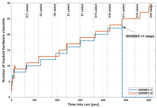 The selected test scenario includes GPS L1/L5 and Galileo E1/E5a signals. The HW integration time is set to 1 ms for both receiver platforms. Figure 5 shows the result of this test. At the start of the scenario, five SVs are enabled. Afterwards, one SV is added with at 1 min intervals. The number of tracked HW channels increases with respect to time. The trend is similar in both platforms, until E11 is added at the 480th second, where all of a sudden, the GOOSE© v1 stops while the other keeps tracking more SVs.