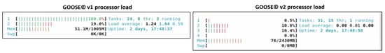 Figure 6 presents the computational load of both receivers at the break point of GOOSE© v1. Due to the high time complexity of the communication interface between PL and PS, the GOOSE© v1 cannot close the tracking channels in less than 1 ms. Consequently, the receiver SW application increases the computational load to a level until it terminates.