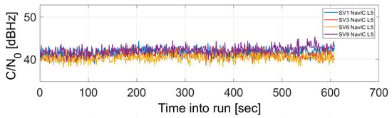 The first test demonstrates that the platform can acquire and track the L5 band of all the NavIC satellites visible from the test facility. The test setup is composed of GOOSE© v2 connected to the NavIC reference antenna. The NavIC reference antenna is mounted on the roof of the Fraunhofer IIS building in Nuremberg. Figure 7 shows that four L5 signals are acquired and are in stable tracking with a carrier-to-noise density ratio () of approx. 40 dBHz.