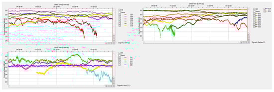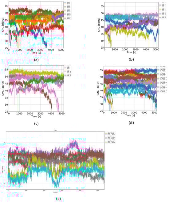 Figure 8c,d show the results of the GPS L5 and Galileo E5 AltBOC on the GOOSE© v2. The results of the same signals using Septentrio PolaRx5 are provided in Figure 10. In this case, the of the two platforms is comparable and the same signals are tracked. No relevant difference can be observed for the L5-E5 band.