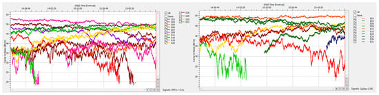 To evaluate the more commonly used GPS and Galileo constellations, an additional test was performed. GPS L1CA and L5, Galileo E1BC and E5 AltBOC, and NavIC L5 and S were tracked using the NavIC reference antenna. In parallel, Septentrio PolaRx5 receivers also track signals of the same constellations. Figure 8a,b show the results of the GPS L1CA and Galileo E1BC using the GOOSE© v2. The results of the same signals using Septentrio PolaRx5 are provided in Figure 9. Here, we can see a slight difference in the amount of signals tracked due to the higher sensitivity of the commercial receiver.