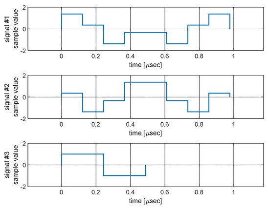 In navigation satellite systems, except for GLONASS (Global Navigation Satellite System) and FDMA (frequency-division multiple access) [1], several independent signals are transmitted syn-chronously in time at an identical carrier frequency. They use direct-sequence spread-spectrum signals but, unlike typical wireless communication systems, the signals can have different chip rates and chip pulses [2,3,4,5,6]. Although the signals use different spreading codes, the chip pulses are designed to guarantee far lower inter- and intra-system interference. Furthermore, the signals in a frequency band are properly multiplexed to have a constant envelope, in order to maximize the power efficiency of the high-power amplifiers.